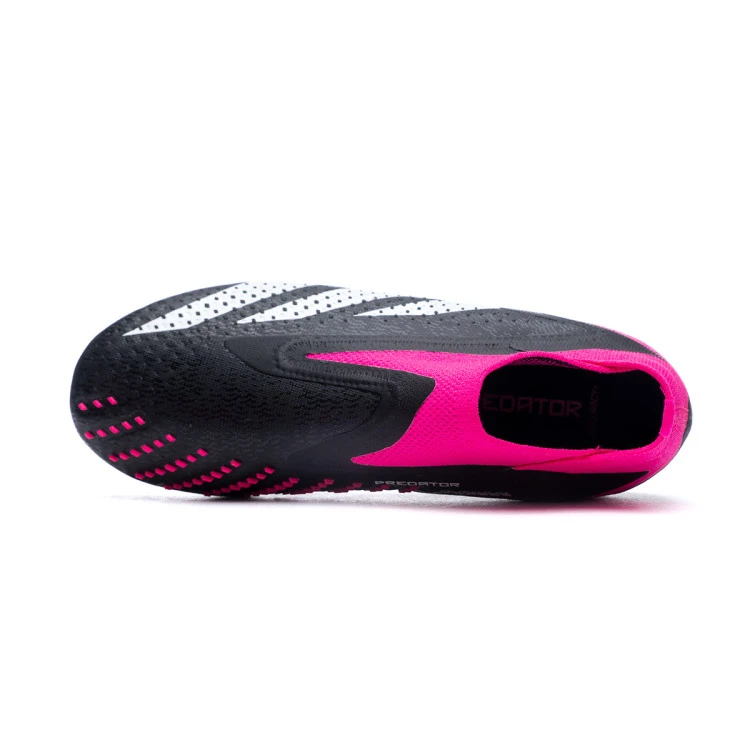 Bota de fútbol Predator Accuracy+ FG para niños. Botas sintéticas sin cordones para utilizar en camadidas pos de hierba natural. Botas de gama alta en color Black-White-Shock Pink.